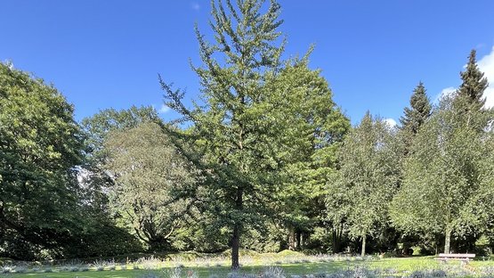 Ansicht der Internationalen Kriegsgräberstätte des Ohlsdorfer Friedhofs mit Blick auf Grabsteine, Bäume und Gedenkmauer