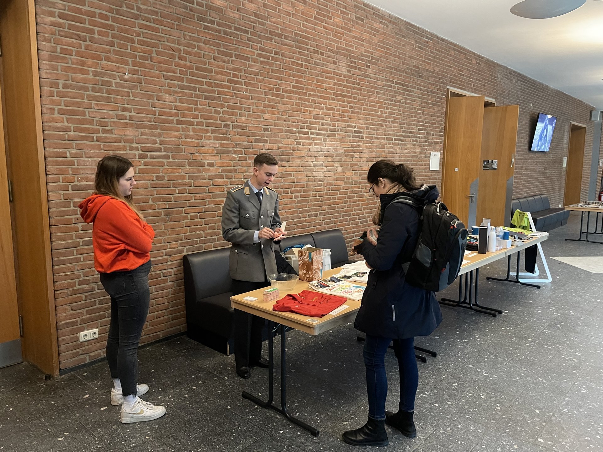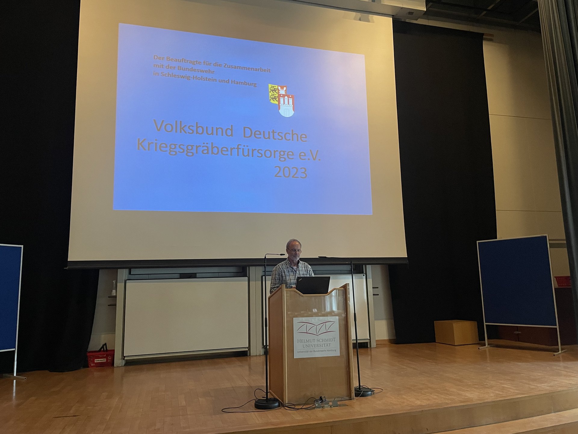 Am gestrigen Donnerstag kamen in der Aula der Helmut-Schmidt-Universität Offizieranwärter und -anwärterinnen zusammen, um mehr über den Volksbund zu erfahren. Der Bundeswehrbeauftragte Oberstleutnant a. D. Michael Oswald stellte die Geschichte und Arbeit des Volksbundes vor und wurde dabei von Leutnant Benjamin Ganseforth unterstützt. Ganseforth konnte Einblicke in die Projekte des Landesverbands geben und aus seiner Zeit als Praktikant berichten. Gleichzeitig wies er auf die Ausschreibung neuer Praktika hin, die in den nächsten Wochen erfolgen wird.