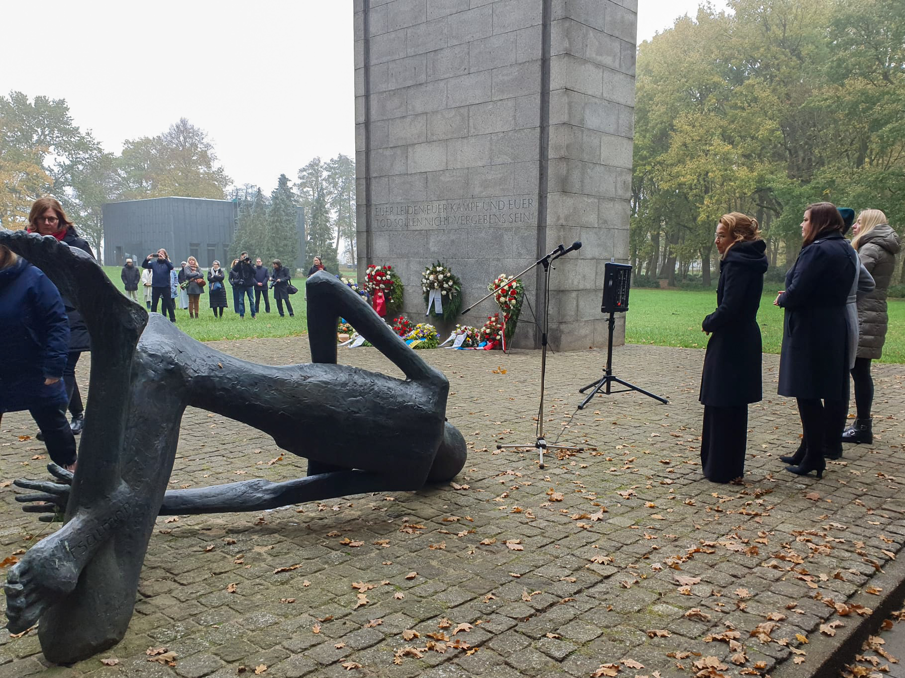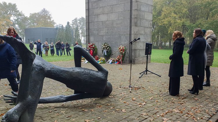 Am Mahnmal der KZ-Gedenkstätte in Neuengamme legten die Präsidentin der Hamburgischen Bürgerschaft Carola Veit und Hamburgs Zweite Bürgermeisterin Katharina Fegebank Kränze nieder. Bürgerschaftspräsidentin Carola Veit sagte in ihrer Rede in Neuengamme: „Seit 262 Tagen erleben wir, was Krieg in Europa für uns bedeutet. Der Einmarsch der russischen Armee in die Ukraine verursacht so viel menschliches Leid. Es ist ein Angriff auf Freiheit, Demokratie und alle Werte, die sich die Weltgemeinschaft nach 1945 gegeben hat. Indem wir die Ukrainerinnen und Ukrainer unterstützen und die Auswirkungen des Krieges gemeinsam als Gesellschaft meistern, kämpfen wir für diese Werte. Das ist alternativlos, wollen wir nicht das „Nie wieder“, dass uns zum Leitgedanken am Volkstrauertag geworden ist, aufgeben. Gerade in diesen schweren Zeiten kann unser Bestreben nur sein, unser Leben auch künftig in Freiheit und Frieden zu gestalten. Das ist das essenzielle Vermächtnis der Opfer des KZ Neuengamme, nach dem wir unser heutiges Handeln ausrichten.“